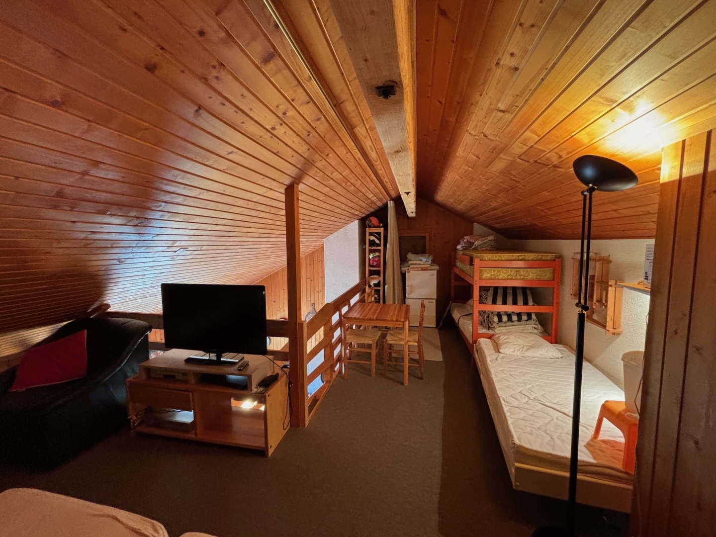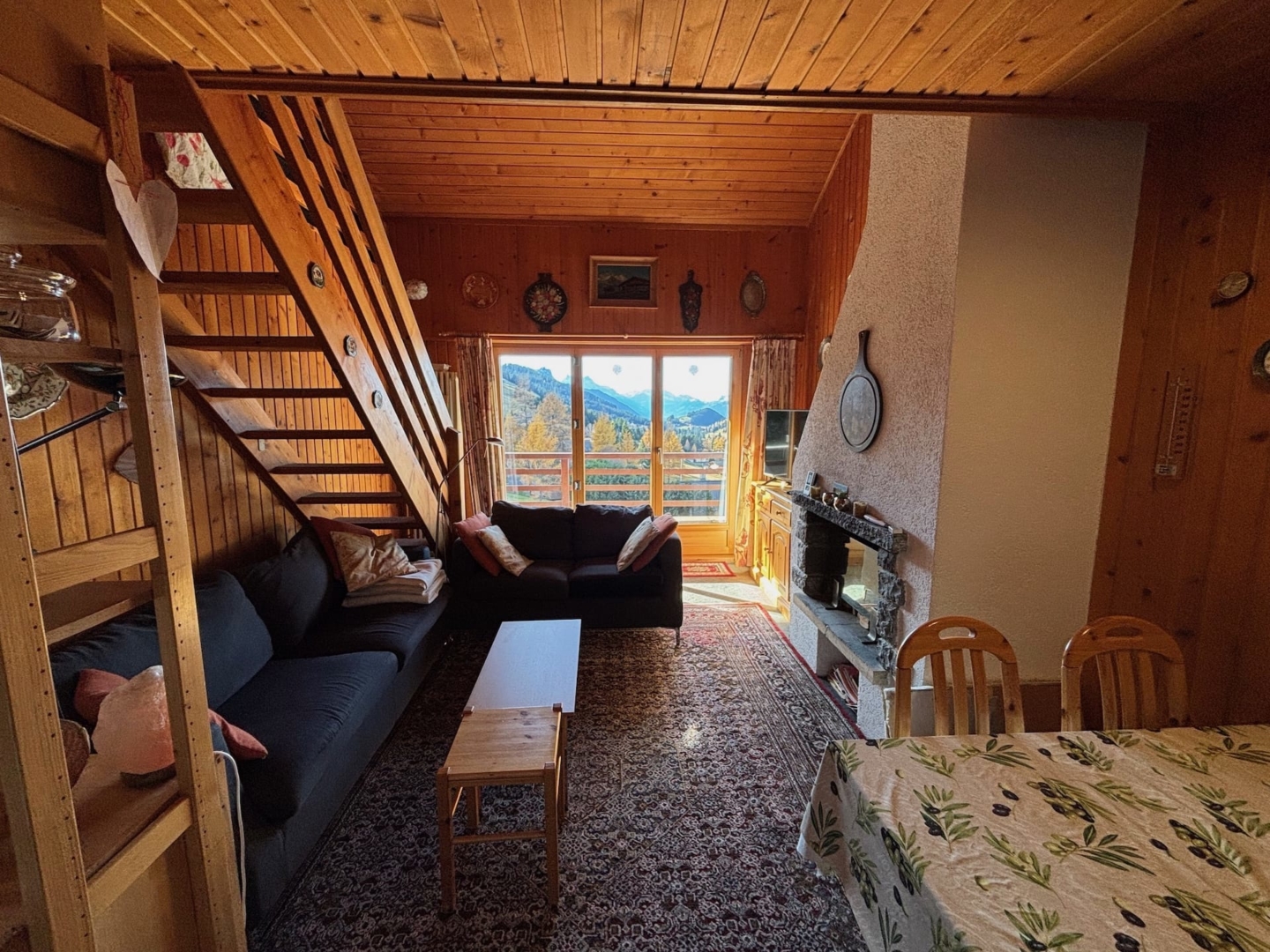 Entrance hall with cupboards – bathroom and toilet – double bedroom with access to south-facing balcony – kitchen opening onto dining room – living room with fireplace – large mezzanine with two bunk beds and 2 double beds – access to south-facing balcony from living room – ski room – private cellar.